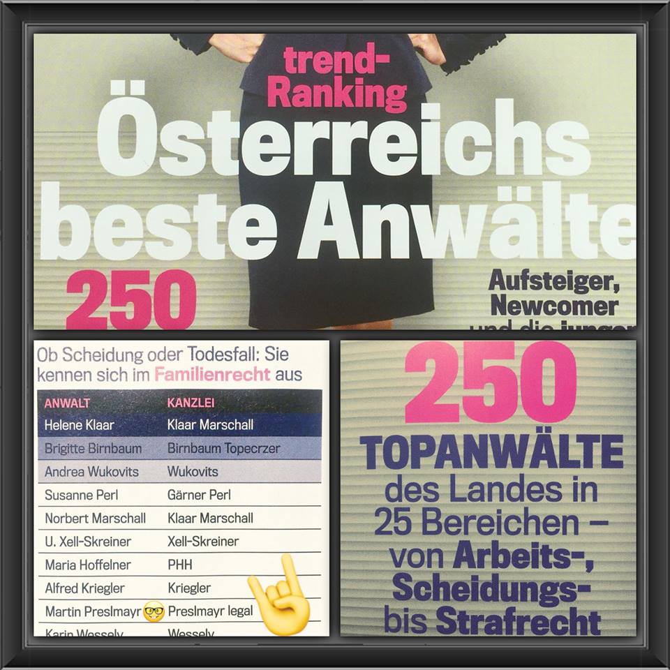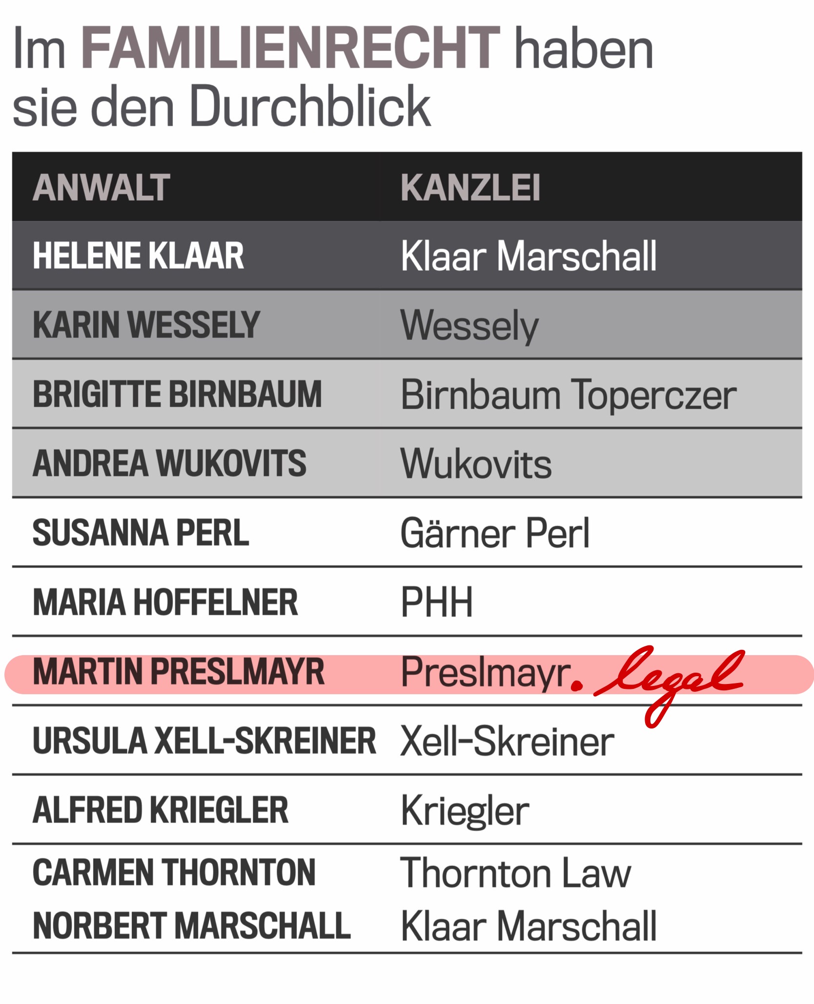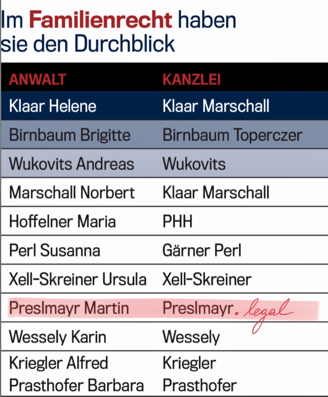 2024 - Männliche Nummer 1 unter den Scheidungsexperten 2023 - Bester Scheidungsanwalt Österreichs #trendranking Recht anders - auch im Leben. Trend.law Bester Scheidungsanwalt Österreichs 2021: Bester männlicher Scheidungsanwalt Österreichs Zu Gast in der Expertenrunde: das Corona-Forum auf Puls24 2020: Bester männlicher Scheidungsanwalt und Familienrechtsexperte Welches Strafausmaß kann Kinder treffen, die töten? KURIER vom 28.7.2019 Wie weit darf Notwehr gehen? Was erlaubt mir der Gesetzgeber? Puls4 gibt genaue Einblicke im Magazin mit Dr. Martin Preslmayr Auch dieses Jahr wieder unter den Top-Anwälten Österreichs im renommierten Trend-Ranking: Die grenzenlose Macht der Kinder- und Jugendhilfe Einladung zur Pressekonferenz am 8.4.2019 um 9:30 Gehacked! Was tun? Expertenkommentar zur geplanten Strafgesetzesnovelle auf ATV-Aktuell vom 10.2.2019 Sexueller Missbrauch in der Familie: Kurier und HEUTE berichten, Jänner 2018 Sexuelle Übergriffe: Wie darf ich mich noch wehren? Puls4 Live Interview mit Dr. Martin Preslmayr Kennzeichnungspflicht für Weihnachtskarten vom Anwalt We keep u protected Studying the future of law with 2 of my children lawpact Österreicher in den USA in Haft: Experteninterview auf PULS 4 Spediteur der Wiener Philharmoniker im Kreuzfeuer In den Startlöchern für den neuen Billa TV-Spot LawPact Spring conference @New York City Top im 3. Jahr in Folge Live bei Vera Rußwurm auf ORF 2: Scheidungsstrategien von Dr. Martin Preslmayr My international network grows Willkommen Österreich mit Elke Silvia Krystufek Im Interview: notwendige Reformen im Privatstiftungsrecht Notwehr in Ebergassing: Kurier Dr. Martin Preslmayr bei Ingrid Thurnher auf ORF III: Expertenrunde zum Thema Frauenrechte und #MeToo Businessrun 2016 Proud us Die besten Neugründungen im Trend Anwaltsranking Unser Wartebereich füllt sich!