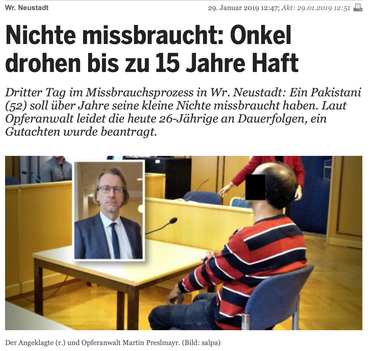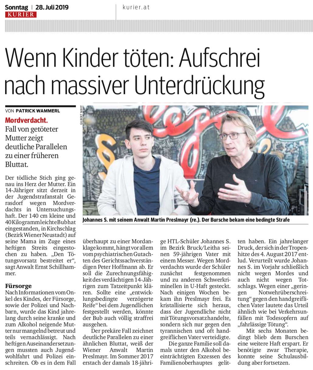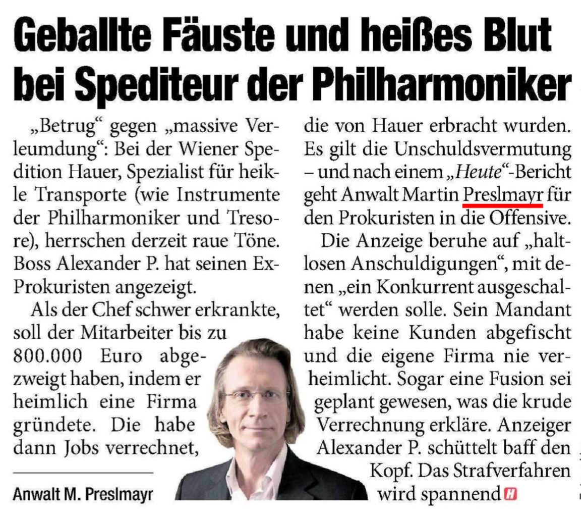 2024 - Männliche Nummer 1 unter den Scheidungsexperten 2023 - Bester Scheidungsanwalt Österreichs #trendranking Recht anders - auch im Leben. Trend.law Bester Scheidungsanwalt Österreichs 2021: Bester männlicher Scheidungsanwalt Österreichs Zu Gast in der Expertenrunde: das Corona-Forum auf Puls24 2020: Bester männlicher Scheidungsanwalt und Familienrechtsexperte Welches Strafausmaß kann Kinder treffen, die töten? KURIER vom 28.7.2019 Wie weit darf Notwehr gehen? Was erlaubt mir der Gesetzgeber? Puls4 gibt genaue Einblicke im Magazin mit Dr. Martin Preslmayr Auch dieses Jahr wieder unter den Top-Anwälten Österreichs im renommierten Trend-Ranking: Die grenzenlose Macht der Kinder- und Jugendhilfe Einladung zur Pressekonferenz am 8.4.2019 um 9:30 Gehacked! Was tun? Expertenkommentar zur geplanten Strafgesetzesnovelle auf ATV-Aktuell vom 10.2.2019 Sexueller Missbrauch in der Familie: Kurier und HEUTE berichten, Jänner 2018 Sexuelle Übergriffe: Wie darf ich mich noch wehren? Puls4 Live Interview mit Dr. Martin Preslmayr Kennzeichnungspflicht für Weihnachtskarten vom Anwalt We keep u protected Studying the future of law with 2 of my children lawpact Österreicher in den USA in Haft: Experteninterview auf PULS 4 Spediteur der Wiener Philharmoniker im Kreuzfeuer In den Startlöchern für den neuen Billa TV-Spot LawPact Spring conference @New York City Top im 3. Jahr in Folge Live bei Vera Rußwurm auf ORF 2: Scheidungsstrategien von Dr. Martin Preslmayr My international network grows Willkommen Österreich mit Elke Silvia Krystufek Im Interview: notwendige Reformen im Privatstiftungsrecht Notwehr in Ebergassing: Kurier Dr. Martin Preslmayr bei Ingrid Thurnher auf ORF III: Expertenrunde zum Thema Frauenrechte und #MeToo Businessrun 2016 Proud us Die besten Neugründungen im Trend Anwaltsranking Unser Wartebereich füllt sich!